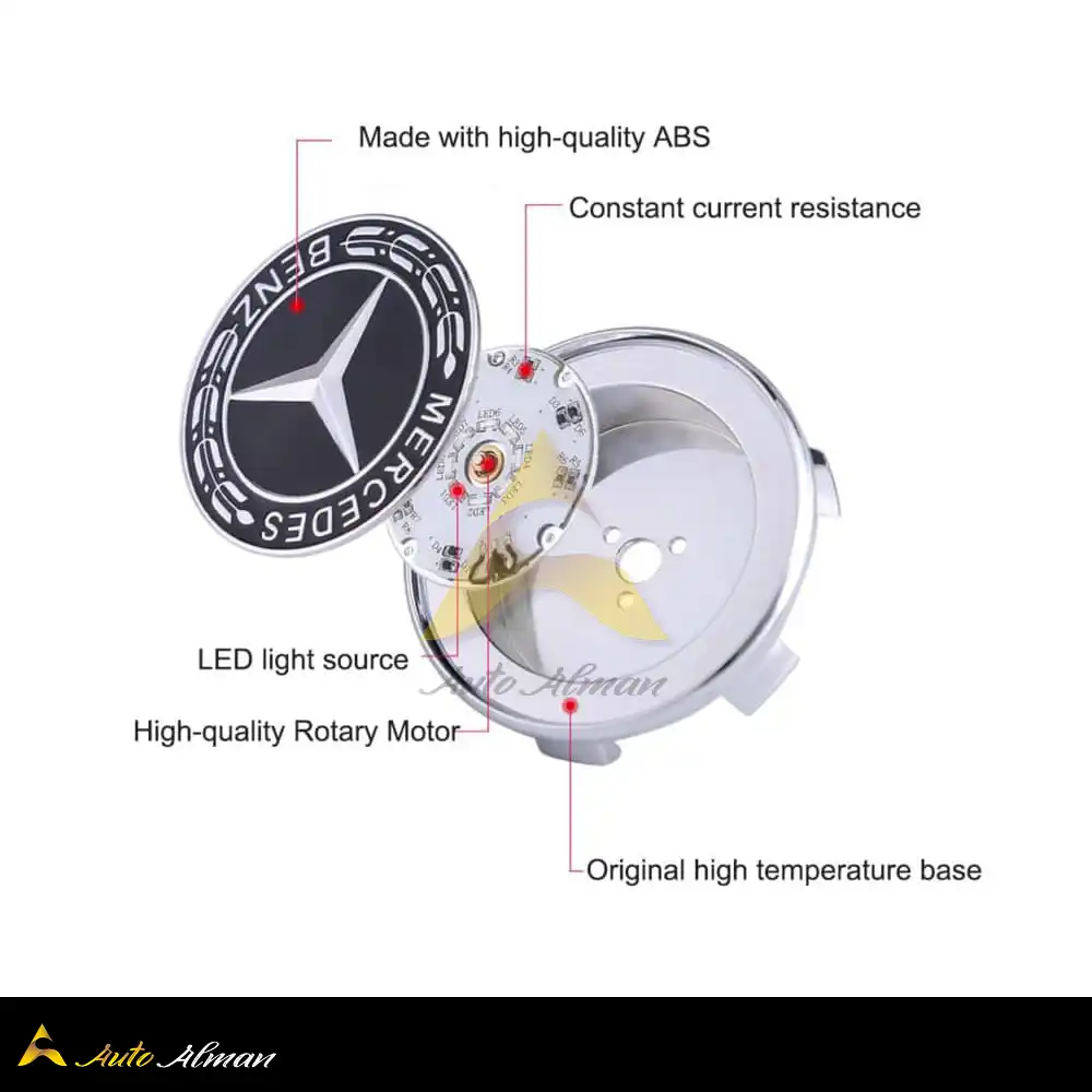 کاپ رینگ تراز شونده مرسدس بنز محصولی خاص و لوکس برای علاقهمندان برند Mercedes-Benz است که جلوهای متمایز به خودروی شما میبخشد. این کاپ رینگ با طراحی شناور (Floating) به گونهای ساخته شده است که در هنگام حرکت خودرو، لوگوی مرسدس بنز ثابت باقی میماند و همزمان نور سفید LED آن روشن میشود.