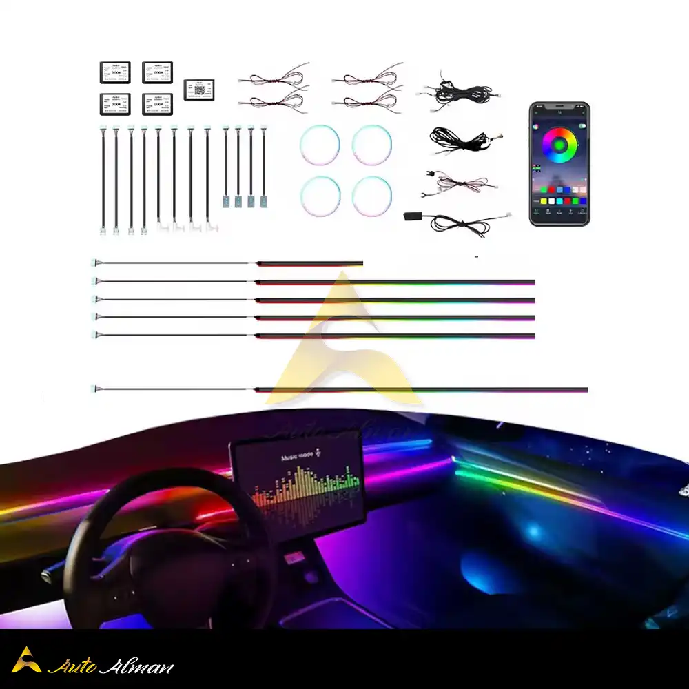 کیت نورپردازی فیبر نوری یا ال وایر RGB شامل ۵ کیت وایرلس بوده که ۴ تیکه نوار برای ۴ درب -۲ تیکه نوار فیبر نوری برای داشبورد ۴ عدد LED برای پشت دستگیره ها ۴ عدد LED برای قسمت جالوانی بغل درب ها و ۴ عدد LED برای زیر داشبورد و صندلی عقب و ۱ عدد LED برای جالوانی کنسول جلو میباشد.